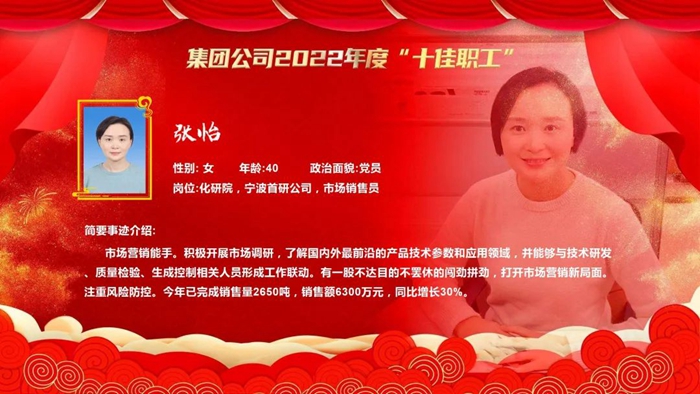 為激勵苦干實干、樹立身邊典型、打造先進品牌,不斷強化廣大職工“企業發展、我有責任,拼搏‘3+1’、我在行動”主人翁意識,促進企業高質量發展,經企業推薦、廣泛遴選、優中選優、民主集中、會議研究,北京化工集團決定,授予北京市化學工業研究院有限責任公司寧波首研公司市場銷售員張怡(女)等10名同志北京化工集團2022年度“十佳職工”,并在北京化工集團二屆一次職代會暨2023年度工作會上予以表彰。