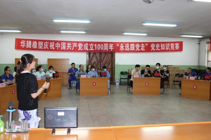 6月22日,華騰橡塑公司黨委舉辦“永遠跟黨走”黨史知識競賽。活動旨在以賽促學,以學促干,激勵廣大黨員干部滿懷信心邁進建設行業領先的科技創新型企業新征程。此次競賽共有8個黨支部組隊參加。各黨支部書記、支部委員、入黨積極分子、共青團員、群眾代表參加活動,并參與觀眾答題環節。