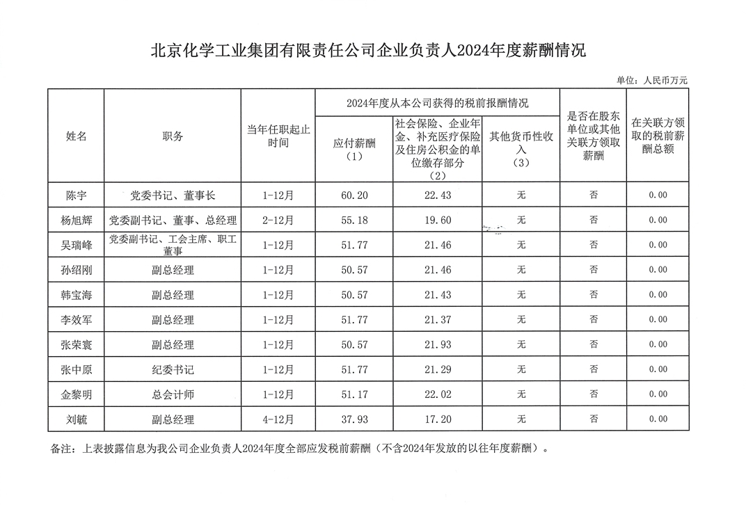 北京化學工業集團有限責任公司企業負責人2024年度薪酬情況