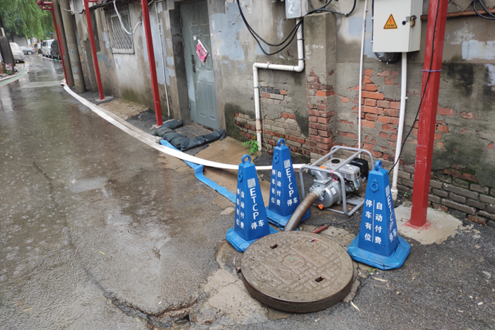 7月29日,在暴雨來襲時刻,北搪公司領導班子和干部職工連夜值守重點點位。大郊亭3號院是老舊平房宿舍區,地勢低洼,也是朝陽區防汛重點點位。為應對此次強度大持續時間長的極端暴雨天氣,公司在3號院安裝了4臺汽油排水泵、4臺小型電器排水泵,鋪設排水管線800米,準備沙袋50個,清理排水雨篦子9個,由于思想高度重視、前期準備工作充分,3號院平安度過這輪強降雨。