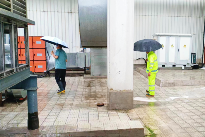 7月30日,屬地普降大雨,廠區出現大量積水,為防止再次降雨造成水位升高,雨水進入庫房等重點區域,公司領導帶領安全干部隊伍趕赴一線,親力親為,對廠區排水口、井箅子等積存污泥進行及時清除,加裝水泵以加快廠區雨水排放,做到雨停路凈。