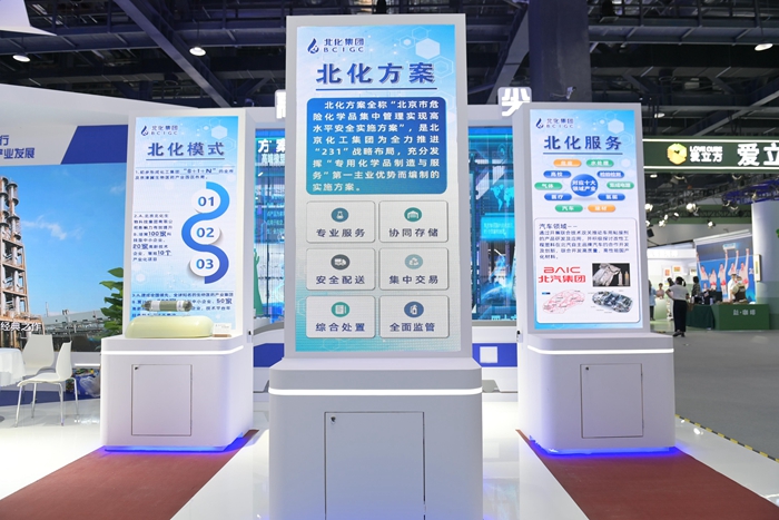 突出展現集團發揮主責主業優勢,圍繞首都“四個中心”功能建設,積極融入“五子”聯動新格局取得的豐碩成果,是北京化工集團此次參展的一大亮點。“三個北化”——“北化方案”“北化模式”“北化服務”展屏矗立其間,構筑安全管理全產業體系、發展生物醫藥大健康產業、服務首都產業鏈安全,成為集團全新戰略方向和目標。