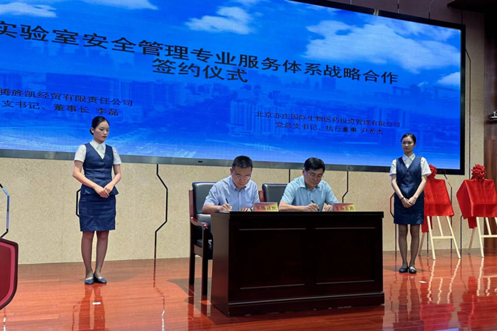 6月27日下午,亦莊醫(yī)藥產(chǎn)業(yè)園危化品統(tǒng)一配送服務(wù)平臺、科研實驗室安全生產(chǎn)教育培訓(xùn)學(xué)院揭牌儀式舉行,北京亦莊國際生物醫(yī)藥投資管理有限公司黨委書記尹希杰,華騰化工黨總支書記、董事長李磊代表雙方簽署了戰(zhàn)略合作協(xié)議,經(jīng)開區(qū)城市運行局相關(guān)領(lǐng)導(dǎo),醫(yī)藥園相關(guān)單位,華騰化工、華騰旌凱相關(guān)領(lǐng)導(dǎo)出席簽約和揭牌儀式,近百人參加。