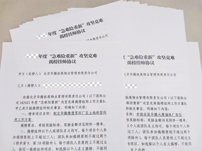 在華騰拓展年初開展的急難險重新“揭榜掛帥”活動中,華騰大廈團隊所揭的榜,直指大廈寫字樓經營開發的“痛點”“難點”。面對任務明確、目標清晰的榜單,這個團隊心中有壓力,但更有干勁兒和沖勁兒。“好像前面有一座堡壘,你的任務就是攻下它!”大廈員工說,“我們得想辦法,老辦法不成,就得想新辦法、出新招,現在我們都在圍繞揭榜轉,團隊的積極性都給調動起來了。”